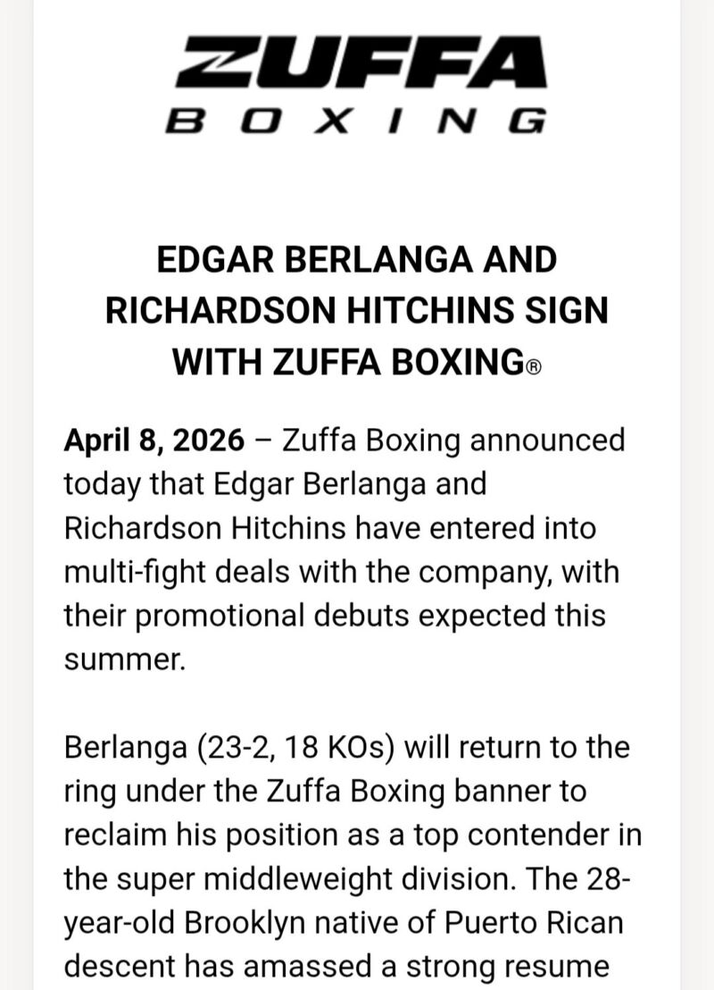 BREAKING: @Zuffa_Boxing has signed super middleweight contender Edgar Berlanga and IBF junior welterweight titlist Richardson Hitchins to multi-fight promotional contracts. They’ll have their first bouts of the deals this summer. They’re both managed by Keith Connolly. #boxing