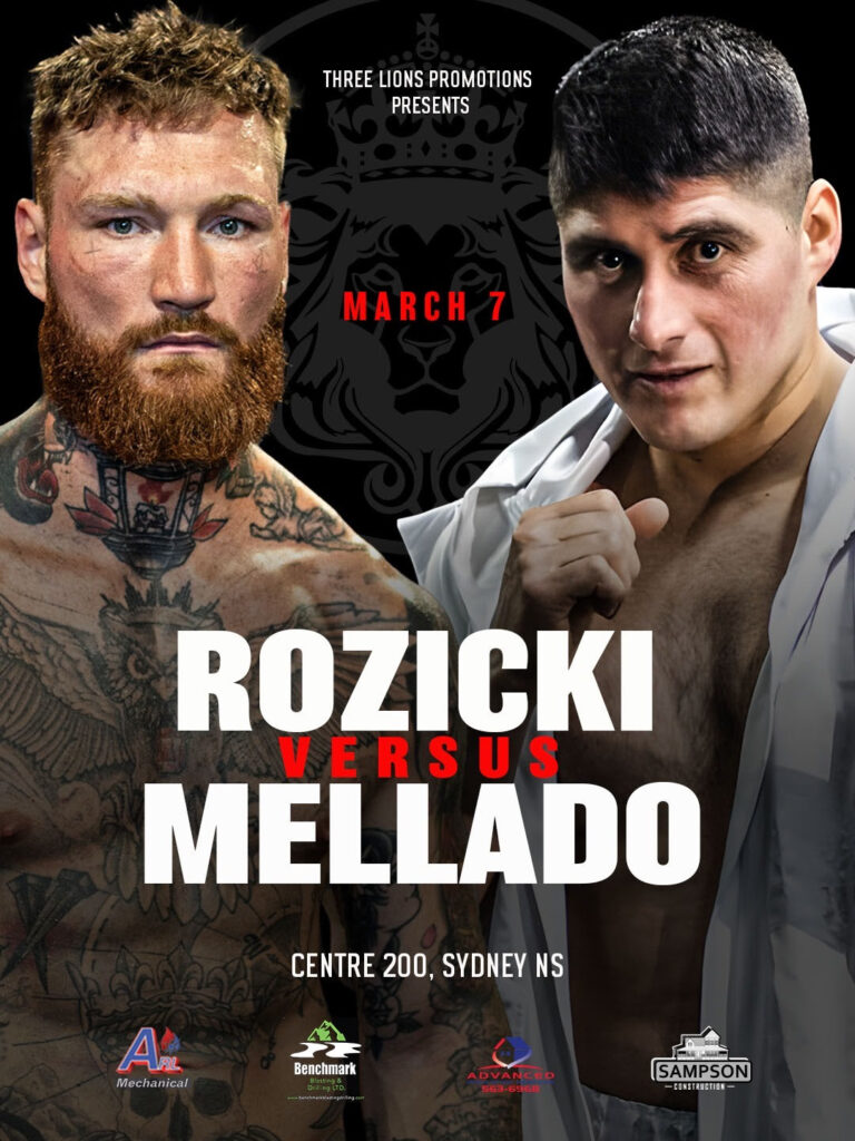 HAMILTON, Ontario, Canada (December 31, 2025) – World cruiserweight contender Ryan “The Bruiser” Rozicki’s long-awaited ring return is officially scheduled for March 7th against Gerardo Mellado in the 10-round main event on a card presented by Rozicki’s promoter, Three Lions Promotions, at Centre 200 in Sydney, Nova Scotia, Canada.