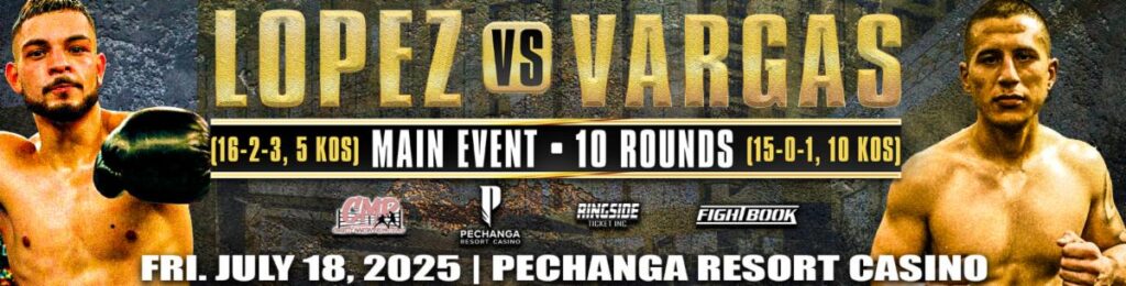 LOPEZ AND VARGAS FIGHT TO EXCITING SPLIT DRAW MAIN EVENT OF CHRISTY MARTIN PROMOTIONS AND PATRICK ORTIZ’S RINGSIDE TICKET INC.’S PECHANGA RESORT CASINO IN TEMECULA, CA Friday, July 18, 2025 – Temecula, CA – Christy Martin Promotions and Patrick Ortiz’s Ringside Ticket Inc., presented “Lopez vs. Vargas,” on Friday night, as Louie Lopez and crosstown rival Adrian Vargas fought to a thrilling split draw in the 10-round welterweight main event from the Pechanga Resort Casino in Temecula, California. The action was also streamed live on Millions.co. Not there to waste any time, both fighters came out firing from the opening bell. Vargas (15-0-2, 10 KOs) stung Lopez (16-2-4, 5 KOs) with a hook in round two, although Lopez got his share of big shots in as well. Lopez punctuated a strong round four by landing a sharp right hand that briefly forced Vargas to hold on. Vargas, who had never previously gone past four rounds in his career, appeared to be coming on in rounds five and six, but ran into a strong right hand from Lopez in the seventh that shifted the fight’s momentum yet again. After a strong round nine for Vargas, Lopez closed the show well by edging out a competitive final round. After 10 blistering rounds that had the large crowd on its feet, the scores were 96-94 Vargas, 99-91 Lopez and 95-95. In the night’s 10-round co-featured bout, WBA-NABA Super Welterweight Champion Emeka “The Lion Heart” Nwokolo (16-1, 13 KOs) of Los Angeles via Benin City, Nigeria, successfully defended his title with a well-fought 10-round unanimous decision over late-sub opponent Jose “El Guerro” Sanchez (14-6-1, 4 KOs) of Albuquerque. Sanchez, who had been scheduled to fight Abel Ramos on tomorrow night’s Pacquiao vs. Barrios card, started well, gliding around the perimeter and catching Nwokolo coming in several times with sharp right hands. The clear aggressor throughout, Nwokolo had a good round six, as he upped the intensity and trapped Sanchez against the ropes with an extended two-fisted attack. Nwokolo appeared to badly sting Sanchez in an exciting round nine with a left hook, but the rugged New Mexican managed to stay on his feet and even landed a few haymakers of his own near the end of the round. Miraculously, Sanchez came out for round 10 looking energized and landed several multi-punch salvos to the head of Nwokolo. “That guy is a warrior,” said a happy Nwokolo, post-fight. “I’m looking for any opportunities I can get. I’m ready to take on anyone.” The scores were 97-93 x 2 and 96-94, all for the champion. 18-year-old former two-time national amateur champion Paolo “Pow” Barredo (4-0, 2 KOs) of Walnut, California, scored a dominant four-round decision over 30-fight super featherweight veteran Luis Valdez (8-21-1, 2 KOs) of Tijuana. Showing patience, the well-schooled Barredo finally dropped Valdez with a hook in round three, but the Mexican survival expert was able to avoid being finished and ultimately made the final bell. The scores were an academic 40-35 across the board for the promising Barredo. Super welterweight prospects Devin “White Chocolate” Parrish (5-0-1, 5 KOs) of Chicago and Oscar Trujillo (2-0-2, 1 KO) of Riverside, California, retained their undefeated records by fighting to an exciting six-round split draw. In a fight that could have been contested in a phone booth, both men went to work on each other, nose-to-nose, from the opening bell. Parrish briefly staggered Trujillo with an overhand right in round two and again early in round three with a right hook, but in both cases, Trujillo shook it off and came back with his own power shots. Parrish appeared to be the stronger fighter, while Trujillo was more active. The scores were 59-55 Trujillo, 59-55 Parrish and 57-57. Murrieta, California welterweight Michael “Boogeyman” Meyers (7-2-1, 3 KOs) fought to an entertaining and hard-fought six-round split draw against a game Josias Gonzalez (2-5-2) of Whittier, California. Meyers kept the pressure on, loading up with two-fisted haymakers to the head and body, while Gonzalez moved around the ring firing three- and four-punch combinations. Gonzalez got off to a good start, while Meyers came on stronger in the second half. The scores were 58-56 each way, with a 57-57 card securing the draw. Both fighters expressed the desire for a rematch and the energized crowd strongly agreed. In the opening fight of the night, lightweight William King (6-2-2, 3 KOs) made quick work of Markus Bowes (3-9, 2 KOs). After sizing Bowes up for a minute, King landed a perfect straight right hand at 1:43 of the opening round, dropping Bowes for the full 10 count. King looked sharp and dangerous for a fighter returning from an 11-month layoff. # # #